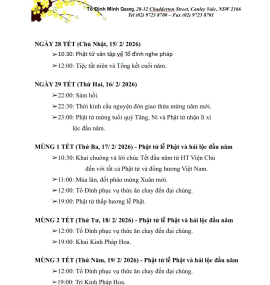 CHƯƠNG TRÌNH ĐÓN XUÂN BÍNH NGỌ 2026 Tổ Đình Minh Quang, 28-32 Chadderton Street, Canley Vale, NSW 2166 Tel (02) 9723 8700 – Fax (02) 9723 8701 NGÀY 28 TẾT (Chủ Nhật, 15/ 2/ 2026)…